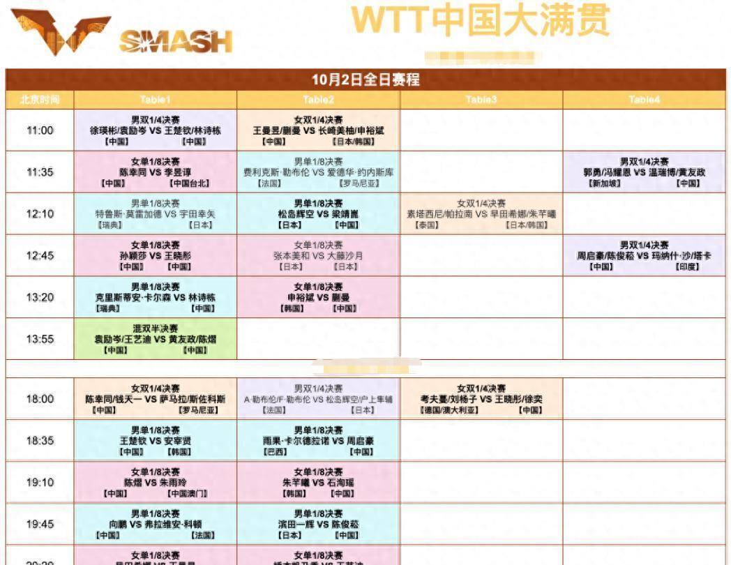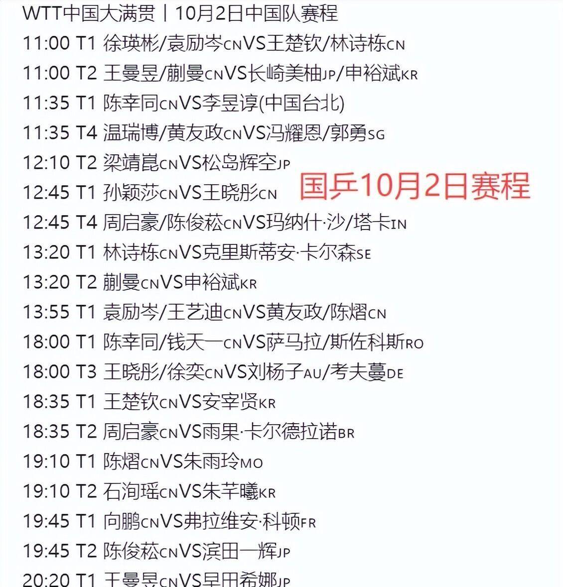 当晚的压轴大戏安排在8点55分,由混双半决赛上演莎头组合王楚钦/孙颖莎对阵巴西组合雨果/布鲁娜。