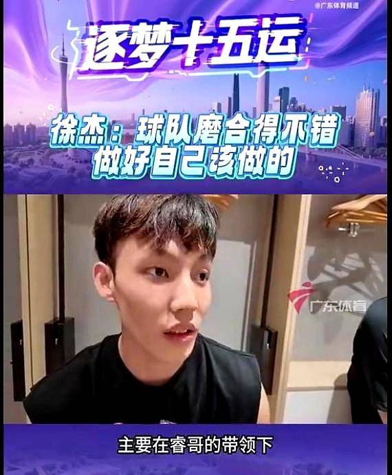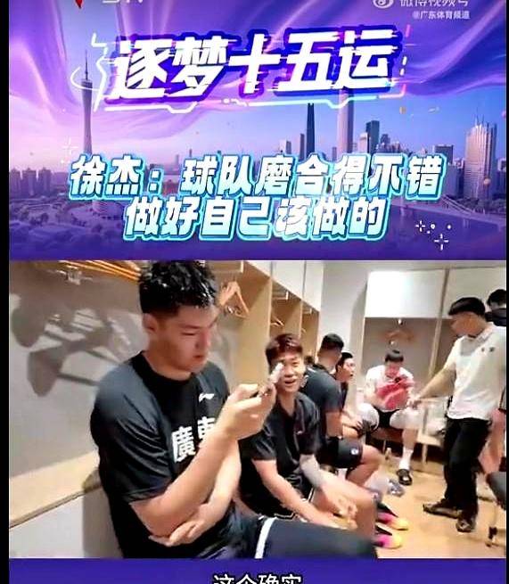 镜头转到广东男篮这边,正在备战全运会的队员们展现出良好的队内氛围。徐杰在接受广东体育频道采访时突然cue到正在热身的赵睿:“我们最近练得特别好,尤其是在睿哥的带领下。”这句话直接把在场记者都逗笑了,镜头马上切换到赵睿的反应。只见赵睿一边擦汗一边对着镜头摆手:“球迷朋友们别被这些年轻球员带偏了节奏啊!”