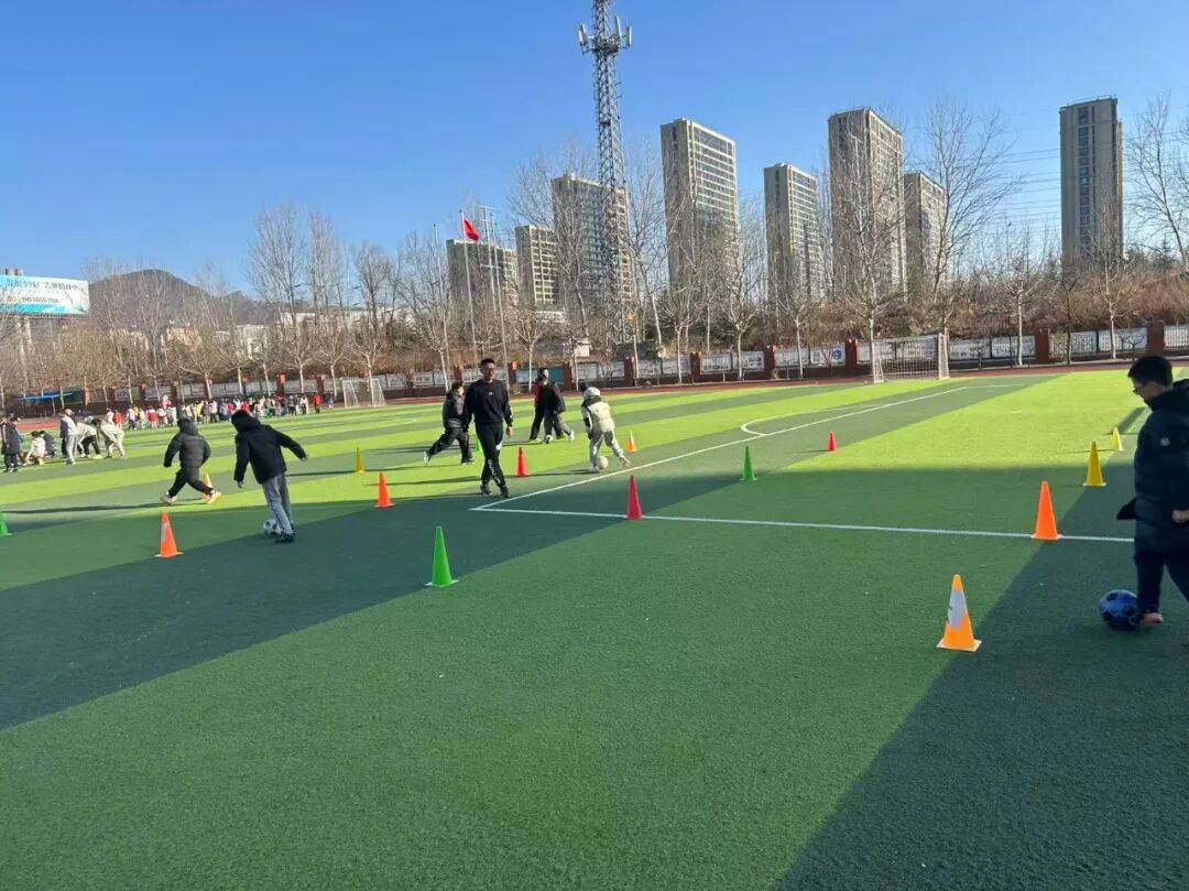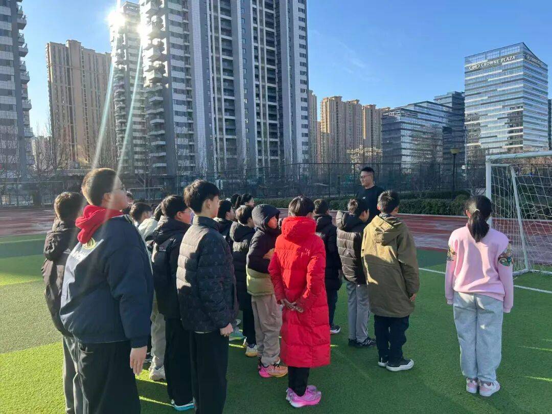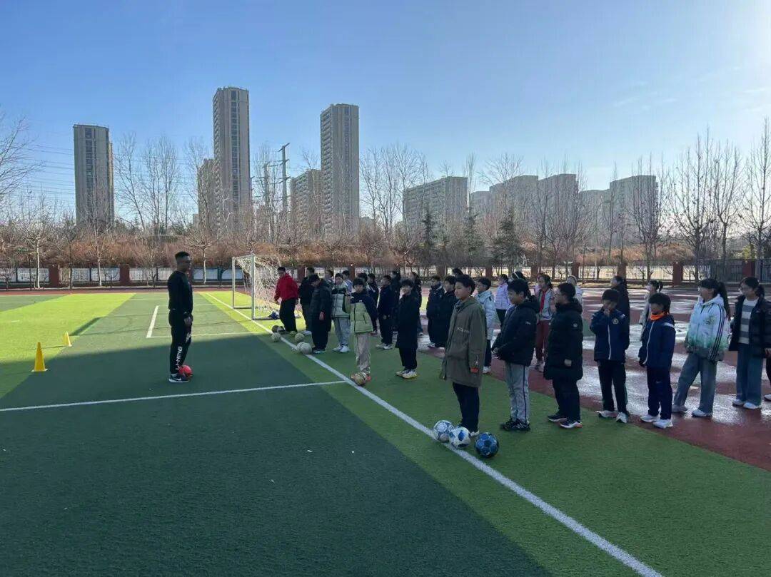 背景中林立的城市楼宇与开阔的运动场相映,冬日的阳光勾勒出师生们专注的身影,也让这堂足球课多了几分温暖的质感。