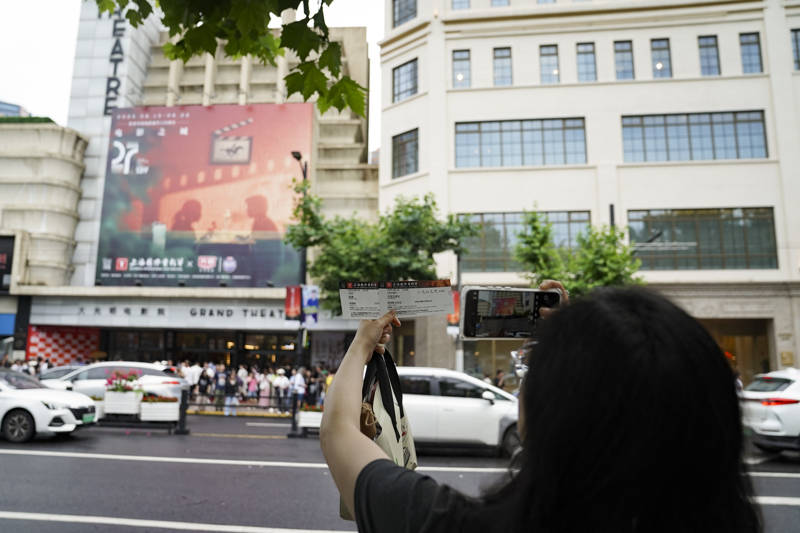 新华社照片,上海,2025年6月20日 6月15日,来自杭州的影迷在上海大光明电影院打卡拍照。 第27届上海国际电影节期间,上海市各区40余家展映影院、200余家公映影院,联动全市核心及重点商圈,打造“看电影+吃喝玩乐”周边消费生态圈。观众持电影节票根可享餐饮、购物等多场景优惠,电影票根成为城市消费“通行证”。 新华社发(陈浩明 摄)