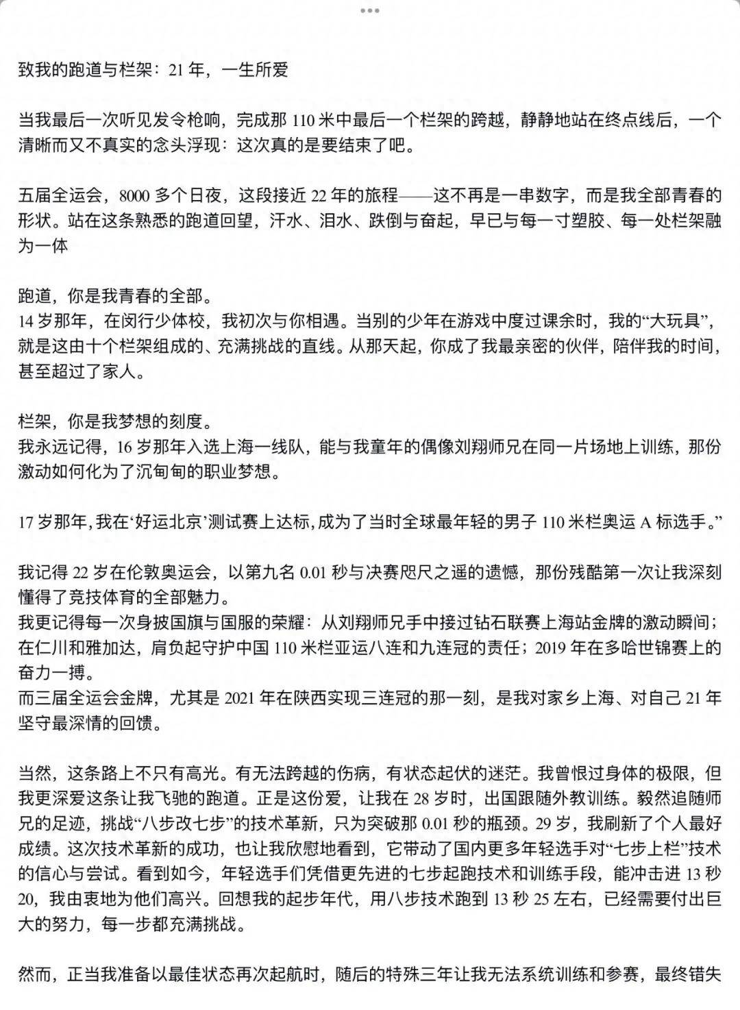他在文中特别提到了刘翔:“感谢我的师兄刘翔,在我职业生涯的最后几年,一直叮嘱我要保护好自己的身体,不要太拼。你是我一路前行的灯塔,是偶像,更是榜样。”