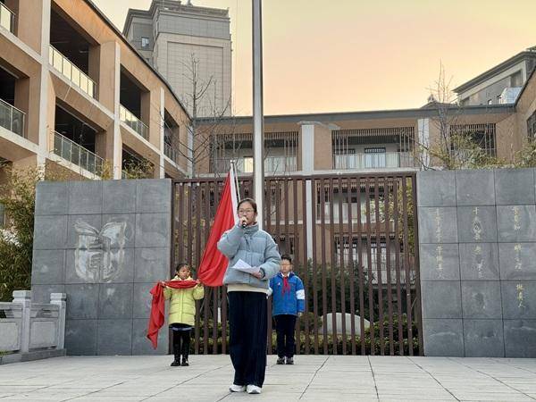 仪式伊始,护旗手们精神抖擞,迈着整齐划一的步伐,护送五星红旗走向升旗台。伴随着雄壮的《义勇军进行曲》,承担这次升旗的付佳欣和杜夏桓两位同学目光坚定,挺拔如松,缓缓升起手中的五星红旗。鲜艳的五星红旗在阳光下高高飘扬,全体老师肃立注目,少先队员们昂首挺胸,立正敬礼,庄严肃穆,嘹亮的歌声回荡在校园上空,爱国的热忱与迎新的喜悦交织在每个人心间。