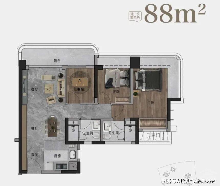 对于刚组建家庭的年轻人来说,88㎡的三房两厅一卫绝对是首选户型。这个户型总价380万起,性价比很高,不会给年轻人带来太大的经济压力,而且空间布局合理,完全能满足小两口或者三口之家的居住需求。