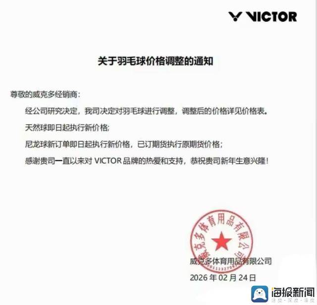 2月24日,威克多率先向经销商发布调价通知,对天然羽毛球、尼龙球执行新价格;随后斯庄格、齐克努等品牌跟进,斯庄格运动互动旗舰店公告称决定对全系列羽毛球降价5元-10元/筒,齐克努全系列羽毛球每筒降价6元;2月28日,亚狮龙宣布自3月1日起下调产品售价,超牌、威肯等品牌纷纷跟进。
