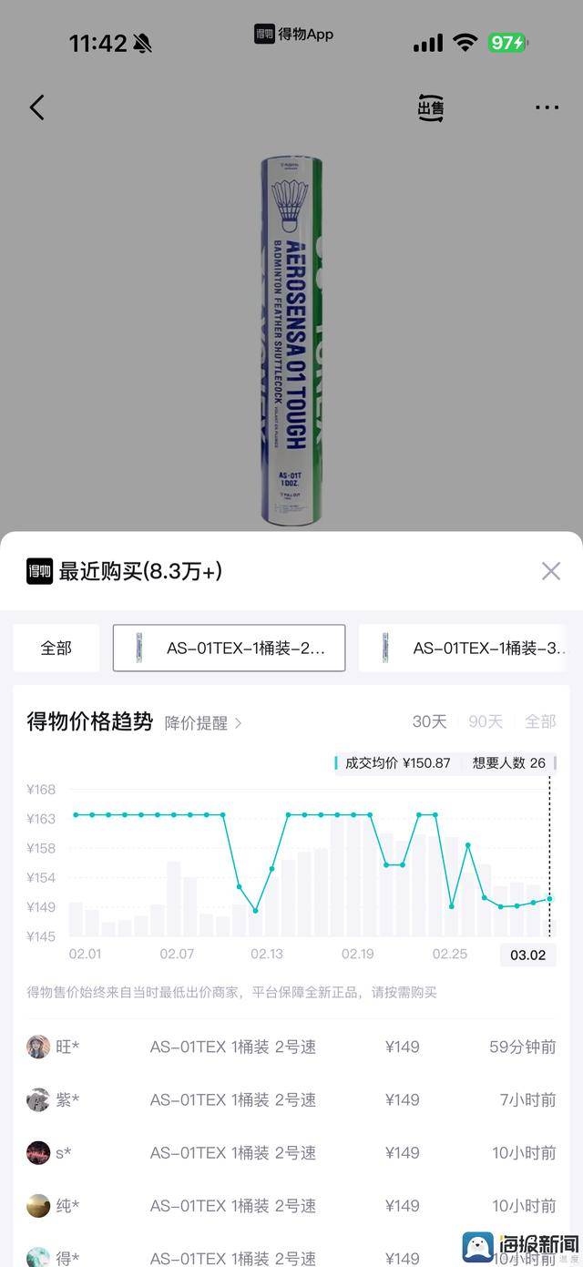 3月3日,得物App平台数据,尤尼克斯鸭毛羽毛球成交均价从1月份的169元降至149元,单筒下调20元。