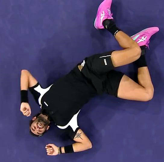 最后来猜一猜认一认。下面这张图片是一位球员赢球后倒地。不作提示,您能认出他是谁吗?