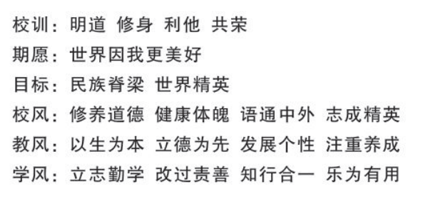 学校秉承“明道 修身 利他 共荣”的校训,以“世界因我更美好”为愿景,以培养“民族脊梁,世界精英”为办学目标。既关注学生的终身成长,也重视学业素养提升,致力于打造一所高品质、高质量、数智化、多元化、国内知名、在国际具有一定影响力的品牌高中。