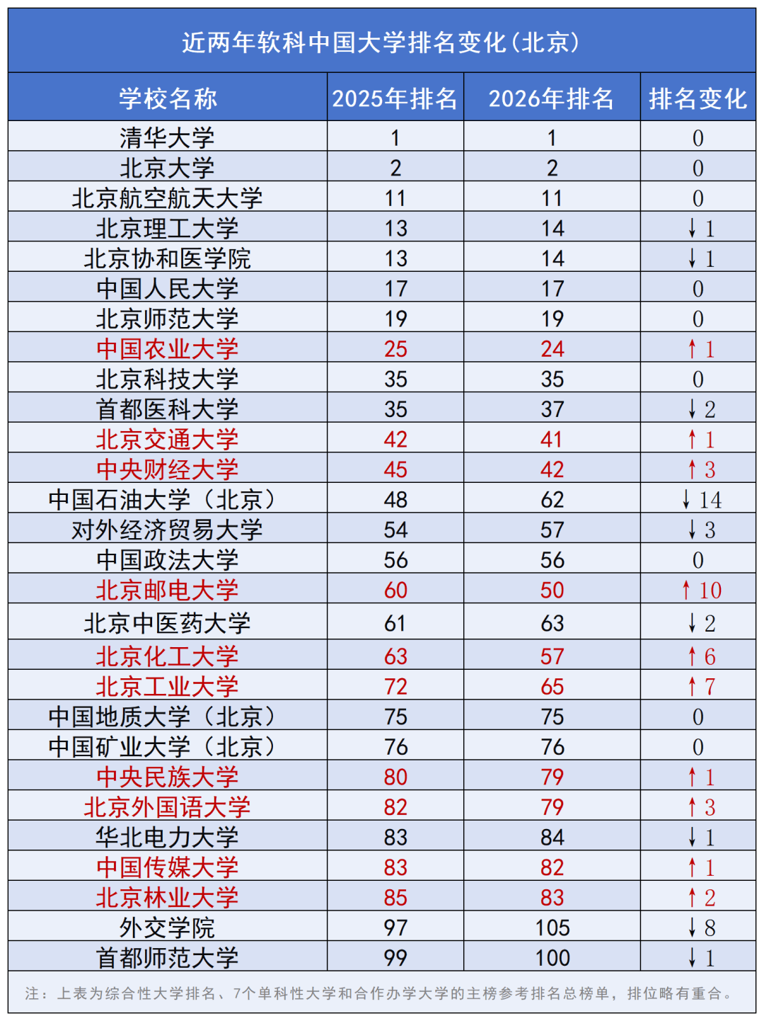 北邮(↑10)、北工大(↑7)、北化工(↑6)、北交大(↑1)均有涨幅。