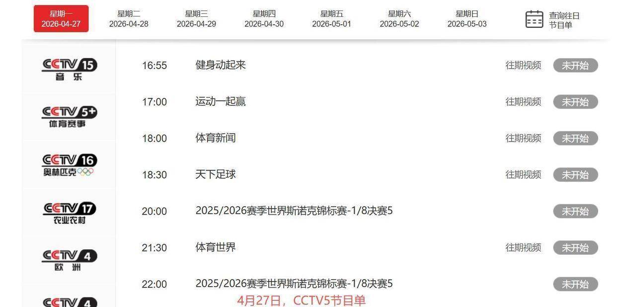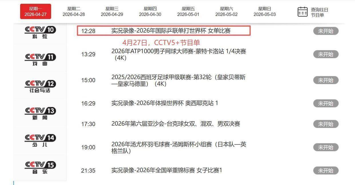 央视的转播表已经全部排定了。 今天4月27日晚上23点05分,CCTV5播出澳门世界杯男单决赛录像;CCTV5+中午12点28分播出女单录像;CCTV16奥林匹克频道晚上18点55分也有世界杯的录像重播。 5月2日,CCTV5+下午5点直播女团中国对罗马尼亚,CCTV5晚上7点半直播男团中国对英格兰。 5月3日,CCTV5晚上7点半直播男团中国对瑞典。